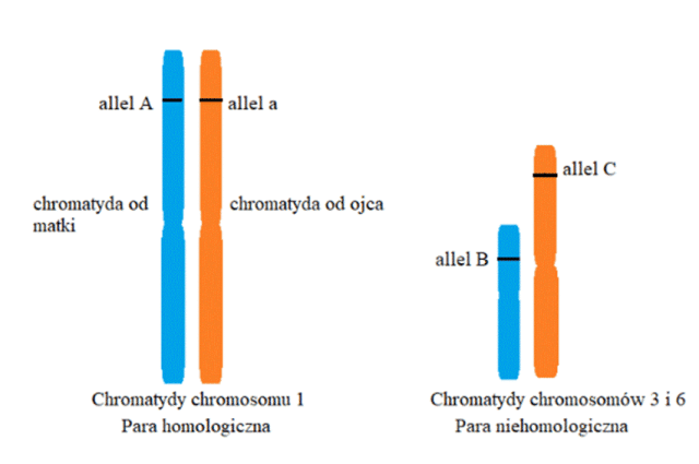 Chromosomy niehomologiczne to takie, które różnią się kształtem, wielkością oraz długością ramion. W kariogramie musisz zaznaczyć po jednej chromatydzie z dwóch różnych par chromosomów.