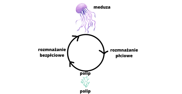 Przedstawiony schemat jest przykładem rozmnażania u parzydełkowców. Polip rozmnaża się bezpłciowo: albo w wyniku strobilizacji, czyli podziału poprzecznego, albo w wyniku pączkowania, które polega na tym, że oderwane od organizmu fragmenty rozwijają się w jego genetyczną kopię. W wyniku tych procesów z polipa powstaje młoda meduza. Połączenie się gamet dwóch dorosłych meduz (rozmnażanie płciowe) prowadzi do zapłodnienia, w wyniku którego rodzi się larwa. Osiada ona na dnie zbiornika i po jakimś czasie przekształca się w polipa.