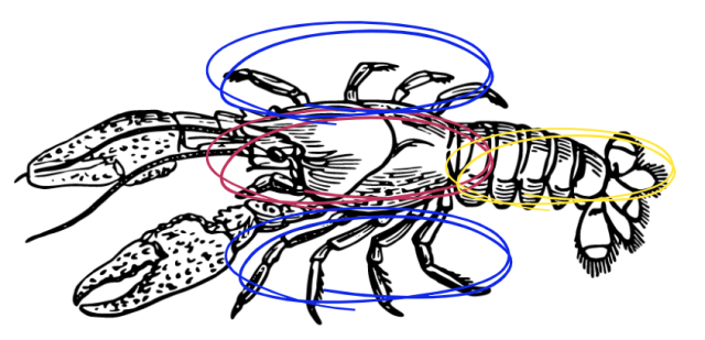 Zastanów się, gdzie na rysunku znajduje się głowotułów (zaznacz na czerwono), gdzie jest odwłok (zaznacz na żółto), a gdzie odnóża kroczne (zaznacz na niebiesko) i pokoloruj je na odpowiednie kolory.