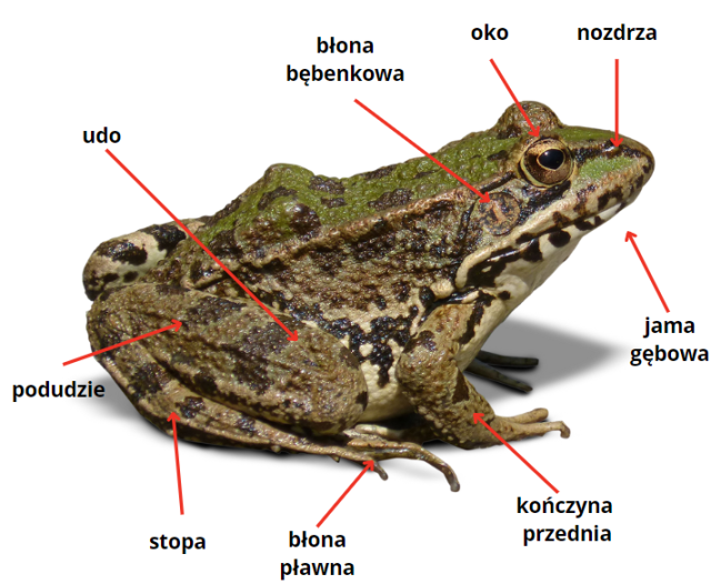 Podpisz odpowiednie części ciała żaby na rysunku i poprowadź linię, by je wskazać dokładnie.