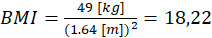 Indeks BMI obliczony dla osoby o masie ciała 49 kg i wzroście 164 cm wynosi 18,22. Według standardowych kategorii BMI wartość ta wskazuje na niedowagę, a nie otyłość. Otyłość jest zazwyczaj klasyfikowana jako BMI równa lub wyższa niż 30, podczas gdy wartości poniżej 18,5 wskazują na niedowagę. W związku z tym osoba w tym przypadku nie spełnia kryteriów otyłości.