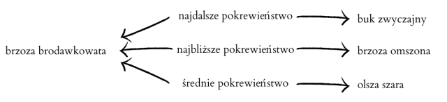 Najbliżej spokrewniona z brzozą brodawkowatą jest brzoza omszona, bo należą do tego samego rodzaju. Dalej spokrewniona jest olsza szara, ponieważ należy już tylko do tej samej rodziny. Najdalej spokrewniony jest buk zwyczajny, z brzozą brodawkowatą łączy go tylko wspólny rząd.