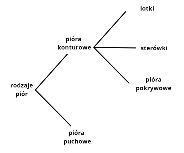 Zapisz na schemacie brakujące nazwy piór. Zastanów się, jakie pióra dzielą się na lotki, sterówki i pokrywowe.