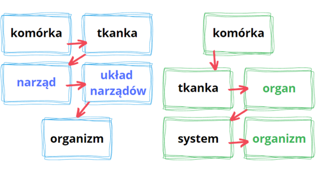 Najprostszym elementem jest komórka. Zbiór komórek to tkanka. Układ tkanek to narząd (lub organ u roślin). Narządy tworzą układ narządów (u roślin jest to system organów). Wszystkie układy narządów tworzą organizm.