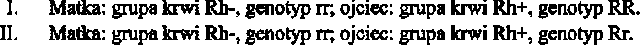 Odpowiedź: W przypadku II jest 50% prawdopodobieństwo, że nie dojdzie do konfliktu serologicznego, ponieważ połowa potomstwa jest homozygotami recesywnymi i nie otrzymuje allelu R od ojca, którego obecność u potomstwa wywołuje konflikt serologiczny.