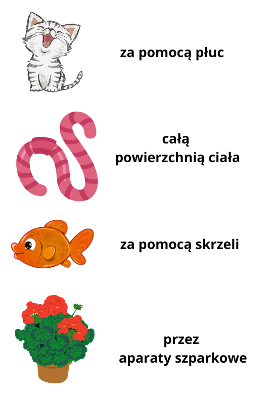 Zastanów się, w jakim środowisku żyją podane organizmy. Zastanów się, w jaki sposób są one w stanie oddychać. Następnie połącz zdjęcia z odpowiednimi informacjami.