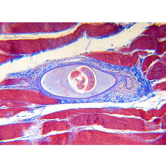 Larwy włośnia spiralnego lokalizują się pomiędzy włóknami mięśniowymi.