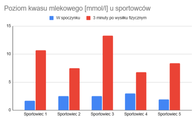 W treści zadania przedstawiono badanie, gdzie u pięciorga sportowców klasy międzynarodowej mierzono poziom kwasu mlekowego. Wyniki badań przedstawiono w tabeli.