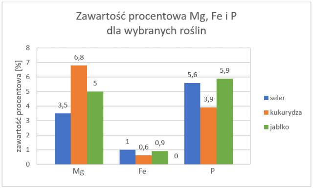 W tym zadaniu musisz, na podstawie danych z tabeli, przedstawić na wykresie słupkowym zawartość Mg, Fe i P dla selera, kukurydzy i jabłka.