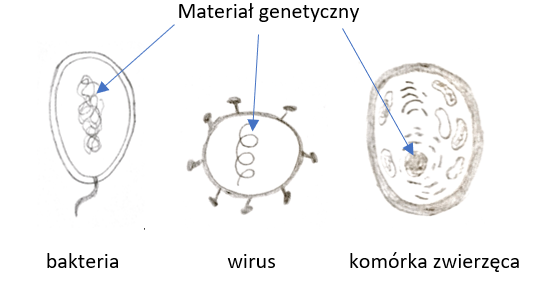 Wszystkie komórki, a także wirusy posiadają materiał genetyczny. W komórkach roślin, zwierząt, grzybów i protistów znajduje się on w jądrze komórkowym. Natomiast u bakterii i wirusów jest on w postaci wolnej.