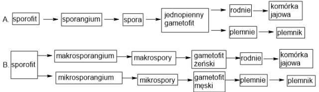 Schemat A dotyczy paproci jednakozarodnikowych, czyli takich, których zarodniki są niezróżnicowane morfologicznie, i z których wyrastają jednopienne gametofity.