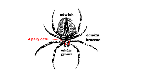 Pająk ma 4 pary oczu, jedna z nich jest duża, umieszczona na przodzie głowotułowia, a 3 pozostałe pary są umieszczone na głowotułowiu z każdej strony. Przez lupę możesz zobaczyć odnóża gębowe.