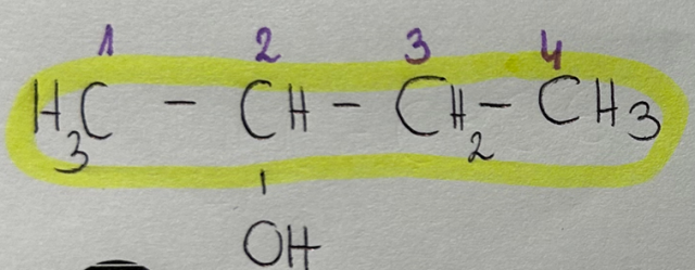1. Wyodrębniamy najdłuższy możliwy węglowy łańcuch główny, zawierający w strukturze atom węgla połączony bezpośrednio z grupą funkcyjną -OH.
