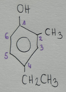 1. W pierwszej kolejności numerujemy atomy węgla w pierścieniu aromatycznym, rozpoczynając od atomu, do którego przyłączona jest grupa -OH. Potem numerujemy atomy węgla tak, aby podstawniki miały jak najniższe lokanty.