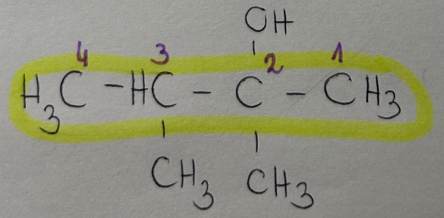 1. Wyodrębniamy najdłuższy możliwy węglowy łańcuch główny, zawierający w strukturze atom węgla połączony bezpośrednio z grupą funkcyjną -OH.