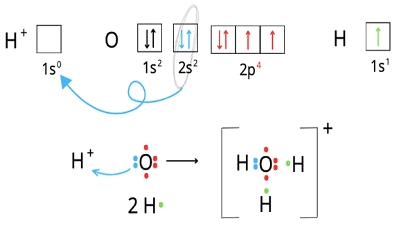 W związku z tym ma ich w sumie tyle, by zapełnić całą podpowłokę 2p. Może zatem oddać elektrony z podpowłoki 2s kolejnemu atomowi wodoru. W ten sposób powstaje kation hydroniowy o wzorze sumarycznym H3O+.