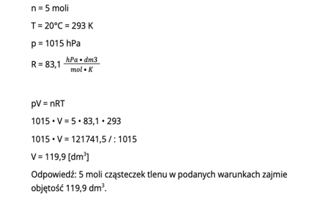 Jaką objętość zajmuje 5 moli cząsteczek tlenu w T = 20°C i pod ciśnieniem 1015 hPa?
