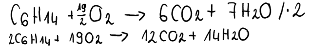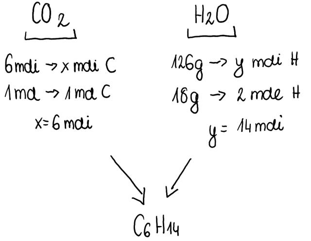 Należy obliczyć liczbę moli węgla w powstałym dwutlenku węgla oraz liczbę moli wodoru w powstałej wodzie, ponieważ takie same jego ilości muszą znajdować się w badanym węglowodorze. W tym celu sporządzamy proporcje, w wyniku której uzyskamy liczbę moli poszczególnych pierwiastków, a co za tym idzie- wzór badanego alkanu: