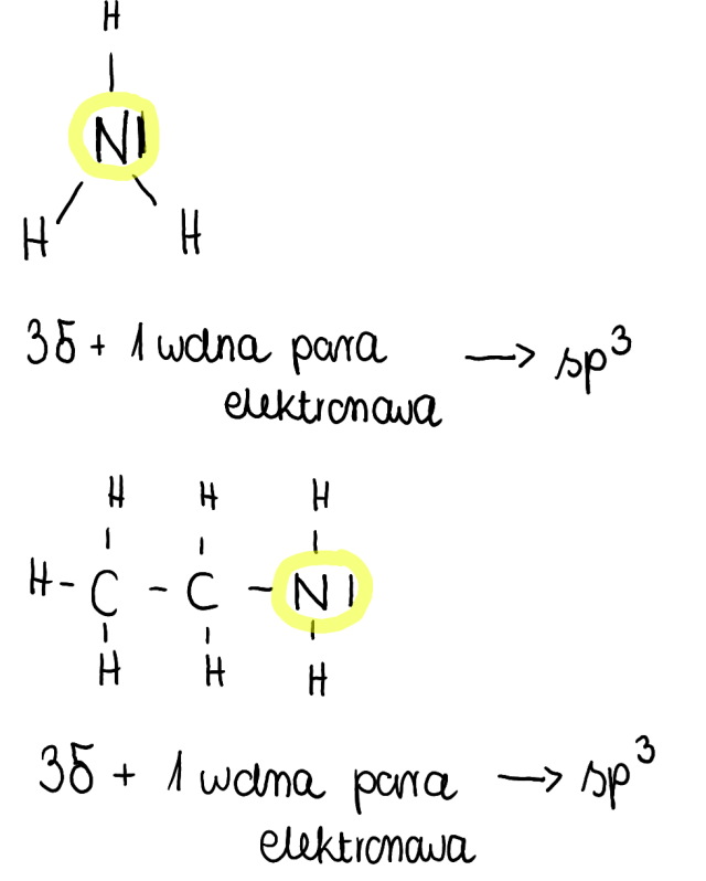 Przedstaw, jak zbudowane są amoniak i etyloamina. Wykorzystaj pojęcie hybrydyzacji orbitali atomowych.
