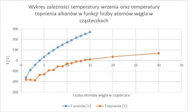 – Jeżeli niebieska linia i pomarańczowa (t. wrzenia i t. topnienia) znajdują się poniżej osi OX (czyli temperatura wrzenia i topnienia są mniejsze od zera) to alkany o odpowiedniej liczbie atomów węgla w cząsteczce będą gazami.