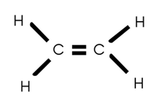 Atom węgla posiada 4 elektrony walencyjne, łączy się wiązaniem podwójnym z drugim atomem węgla oraz dwoma pojedynczymi wiązaniami z dwoma atomami wodoru.