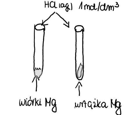 Mg + 2HCl à MgCl2 + H2, natomiast pęcherzyki bezbarwnego, bezwonnego gazu (wodoru) wydzielają się z różną intensywnością. Im większy stopień rozdrobnienia magnezu, tym szybciej zachodzi reakcja chemiczna. W tej sytuacji wiórki magnezu są bardziej rozdrobnione niżeli wstążka magnezowa, zatem mają większą powierzchnię kontaktu z kwasem, co znacząco przyspieszy reakcję ich roztworzenia.