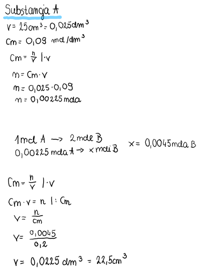 2. Korzystając z równania reakcji, należy obliczyć, jaka stechiometryczna ilość moli substancji B przereagowała z obliczoną liczbą moli substancji A.