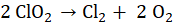 Jest to reakcja rozkładu tlenku chloru (IV). Aby reakcja była zbilansowana potrzebne są dwa mole cząsteczek substratu. Powstają dwa mole cząsteczek tlenu i 1 mol chloru cząsteczkowego.