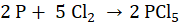 Potrzebne są dwa mole atomów fosforu i pięć moli chloru, aby otrzymać dwa mole chlorku fosforu (V).