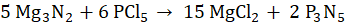 Potrzebne jest pięć moli azotku magnezu i sześć moli chlorku fosforu (V), aby otrzymać piętnaście moli chlorku magnezu i dwa mole azotku fosforu (V).