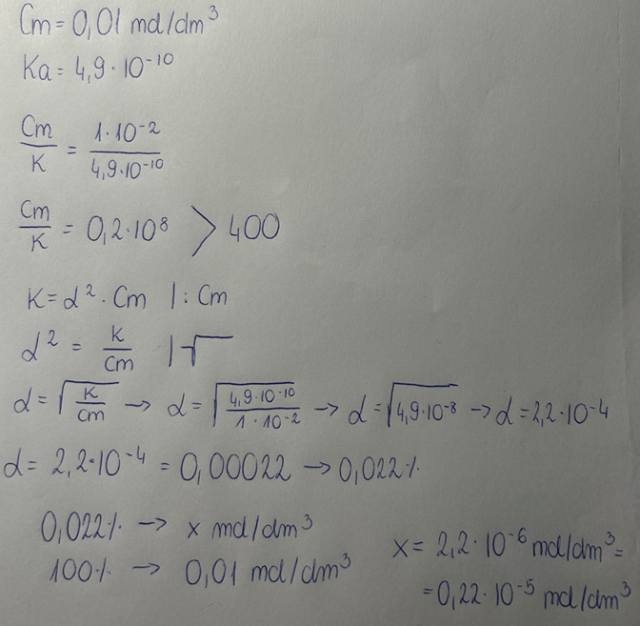 1. W pierwszej kolejności sprawdzamy iloraz Cm przez K, aby ustalić, z którego wzoru należy skorzystać przy obliczaniu stopnia dysocjacji