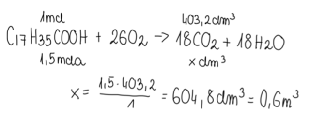 Oblicz, jaka objętość tlenku węgla (IV) (odmierzonego w warunkach normalnych) powstanie, jeżeli reakcji spalania całkowitego poddano 1,5 mola kwasu stearynowego.