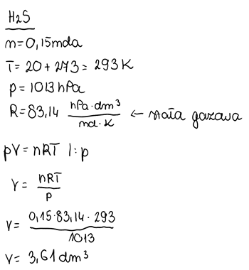 5. Korzystając z przekształconego równania Clapeyrona, obliczamy objętość siarkowodoru użytego w reakcji: