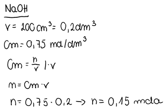3. Z przekształconego wzoru na stężenie molowe obliczamy liczbę moli NaOH biorącego udział w reakcji: