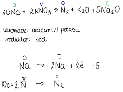 Napisz równanie reakcji, w której udział bierze produkt rozkładu azydku sodu i azotan (V) potasu. Uzgodnij je metodą bilansu elektronowego. Nazwij substancje, które pełnią rolę utleniacza i reduktora.
