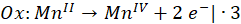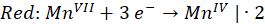 Reduktorem jest atom, który zwiększa swój stopień utlenienia (Mn: +2 → +4), a utleniaczem ten, który zmniejsza swój stopień utlenienia (Mn: +7 → +4).