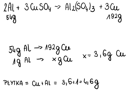 2. Wiedząc, że masę płytki stanowi sama płytka (masa glinu, która nie przereagowała) oraz miedź, która się na niej osadziła, obliczamy tę wielkość.