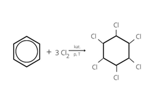 Zapisz równanie reakcji przyłączania trzech cząsteczek chloru do cząsteczki benzenu.