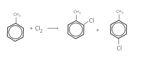 Z jednego mola toluenu powstaje po 1 mol każdego z izomerów. Mają one taką samą masę, więc skład masowy mieszaniny odpowiada składowi molowemu: