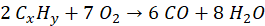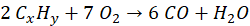 Produktem reakcji jest CO – CO2 reaguje z NaOH, więc jego objętość by się zmniejszyła. Wiadomo, że na 1 objętość węglowodoru przypada 3,5 objętości tlenu i 3 objętości CO: 1 : 3,5 : 3. Po sprowadzeniu do liczb całkowitych: 2 : 7 : 6.