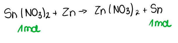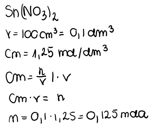 1. Korzystając z przekształconego wzoru na stężenie molowe, obliczamy, ile moli azotanu (V) cyny (II) wzięło udział w zachodzącej reakcji: