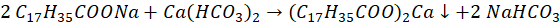 W probówce z wodą mineralną stearynian sodu wszedł w reakcję z wodorowęglanem wapnia.