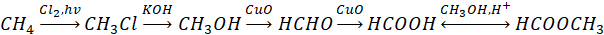Zapisz schemat reakcji otrzymywania mrówczanu metylu z metanu.