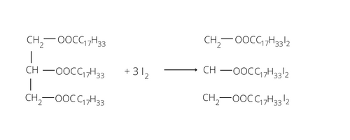 Jod reaguje tylko z trioleinianem – jest to związek nienasycony: