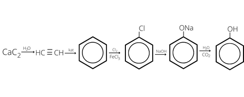 Zapisz schemat reakcji otrzymywania fenolu z węgliku wapnia.