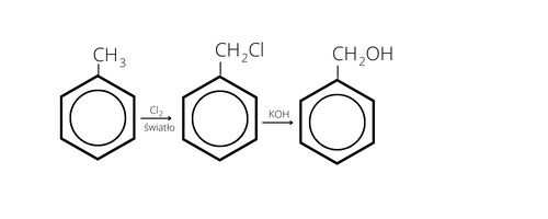 Zapisz schemat reakcji otrzymywania alkoholu benzylowego z toluenu.