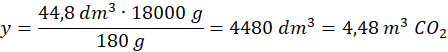 Ze 180 g glukozy powstają 2 mole CO2 – 44,8 dm3 w warunkach normalnych.