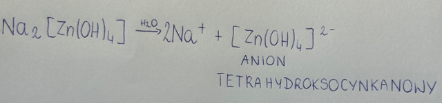 1. W zależności od ilości grup wodorotlenowych, nazwę zaczynamy od słowa „anion”, a następnie dla liczby koordynacyjnej 4 wprowadzamy początek „tetrahydrokso-„, zaś dla 6- „heksahydrokso”.