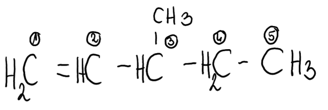 3. Zapisując nazwę węglowodoru, rozpocząć od wymienienia podstawników w kolejności alfabetycznej wraz z przyporządkowanymi im lokantami (wszelkie przedrostki wynikające z krotności podstawników w cząsteczce typu di-, tri-, tetra- nie wpływają na kolejność alfabetyczną), a na koniec dodać nazwę łańcucha głównego z zaznaczeniem atomu węgla, przy którym występuje wiązanie podwójne. Należy pamiętać, że podstawą nazwy łańcucha głównego są nazwy alkanów, gdzie końcówka „an” zostaje zmieniona na „en”.