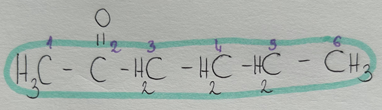 · Ketony, które w swojej strukturze mają co najmniej 5 atomów węgla, mogą różnić się położeniem grupy karbonylowej, dlatego w nazwach takich ketonów należy między rdzeniem nazwy a końcówką ,,-on” wpisać lokant atomu węgla w grupie karbonylowej.